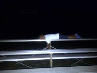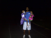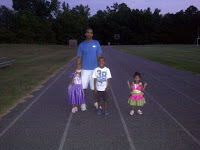 It was nice to be out in the open, at the appropriate hour with only about 5 other people running, jogging and walking around too. We did a cool down lap and Jalen practically collapsed on the bleachers. He was so tired I gave him a piggy back ride to the car, which meant Daddy had to lock and load the biceps (guns) to carry both girls to the car. When we got home all the kids were exhausted. Jalen said he was so tired he needed to go right upstairs and go to bed. Hmm..we may have to have Track Nights more often.