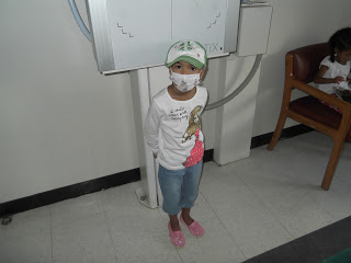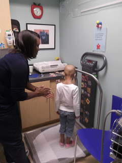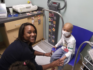 One of our favorite stops at each appointment is seeing Ms. Roz. If there was anyone you know with every part of your being is in the right place, it’s Ms. Roz. She is the first person the children see each week. Ms. Roz check heights, temperatures, lets you know if you need to add some fries with that shake, adorns you with a green bracelet (registration armband) and rewards you with the stickers of your choice for being a good patron. This week Mireya was up a pound, so no shakes needed. During those few important moments spent with Ms. Roz, she radiates joyful happiness and will always bring a smile to your face with her gentle and loving demeanor. Reya enjoys seeing Ms. Roz, especially when she has Princess stickers and even if she doesn’t she still enjoys it and Hello Kitty will do. Mireya also got a really cute cap as a part of the ASK Kourageous Kids Program. They held a ‘Hats Off’ event where they collected over 1,000 hats representing kids going through treatment.