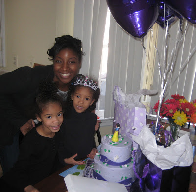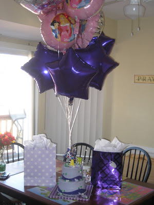 Today is my sweet little Makinley’s birthday. I was contacted last week by Michelle Wilson of Michelle’s Cakery Bakery for a run down on all things Kinley. At that moment it consisted of purple and princesses (specifically Snow White). Just seconds earlier, it was Ariel, wait maybe Aurora. I had no idea what to expect, but was blown away when Michelle and her Mom arrived with this beautiful cake, balloons galore and two beautiful purple gift bags. Tears rimmed my eyes and I just wanted to boo hoo big time. It felt like Publisher’s Clearinghouse had just arrived and I was a major winner! The true prize was the ‘priceless’ smile on Makinley’s face when she saw this beautiful creation. On top of it all Michelle pulled together a princess gift pack for Makinely, purchased everything we needed to complete a celebration (purple plasticware, plates, cups and a tablecloth) AND she made the most adorable purple heart shaped cake pops for Kinley to take to her preschool class. We elected to have a early celebration with my niece and nephew to take advantage of the day out of school yesterday.